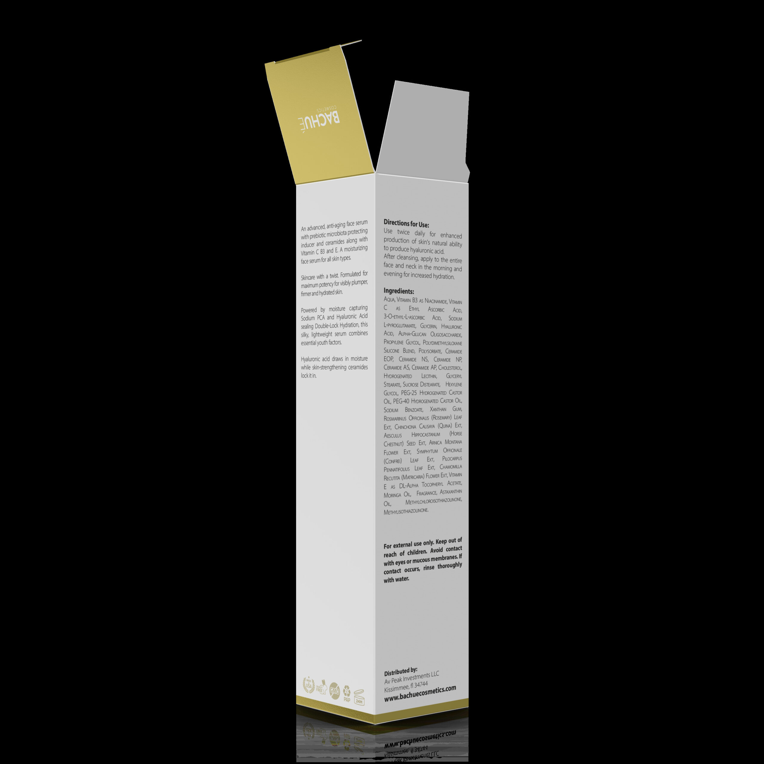 An advanced, anti-aging moisturizing face serum for all skin types with prebiotic microbiota protecting inducer and ceramides along with Vitamin C B3 and E.